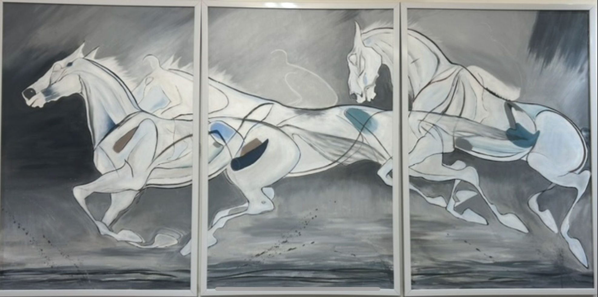 One evening, I found this reference photo of three horses racing across a hazy plain stretching across three separate canvases. The energy, the movement, the mystery everything about it called to me.